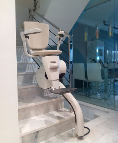 Esta silla salva un desnivel de una planta para facilitar el acceso a los propietarios a la planta superior. Flow2 hace una casa accesible por muchos escalones que tenga, curvas o cambios de pendiente de rasantes.