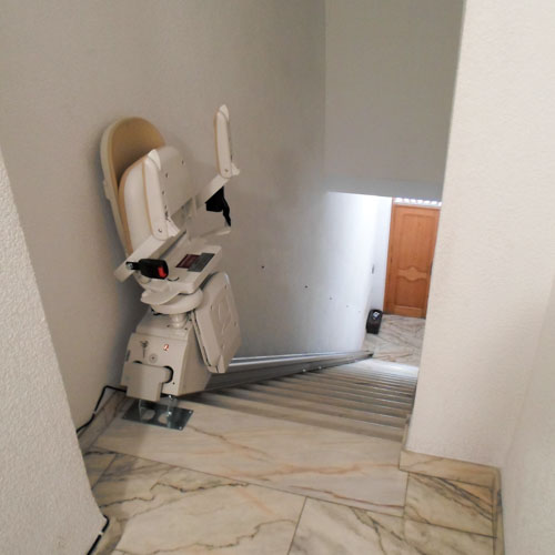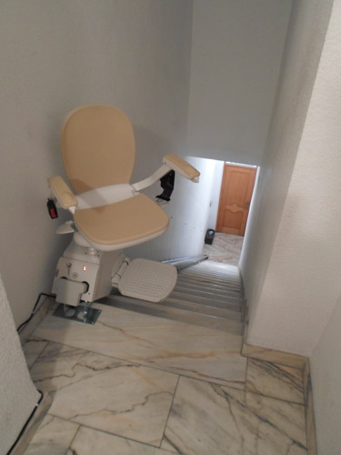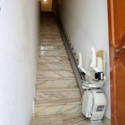 Esta silla ha sido instalada para poder salvar la estrecha escalera y poder acceder a la planta superior donde está situada la vivienda del usuario. Instalada en la parte derecha de la escalera y anclada a los escalones para no entorpecer el paso al resto de usuarios.