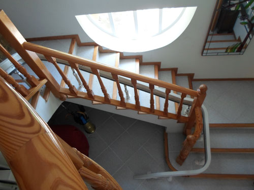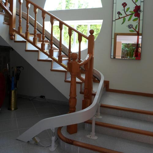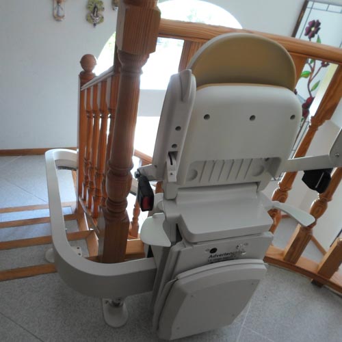 En esta instalación hemos colocado esta silla Acorn para poder superar las curvas de la escalera siguiendo el lado interior de la misma para poder acceder a la planta superior.