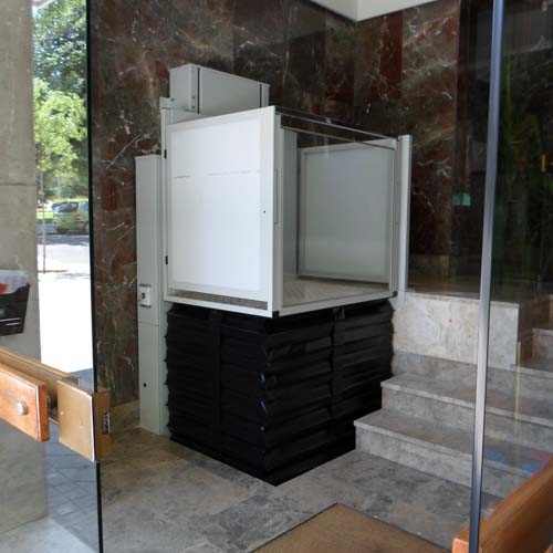 En este edificio se ha eliminado la jardinera para instalar la plataforma vertical Izaro y así poder salvar los escalones que separan la calle del ascensor.