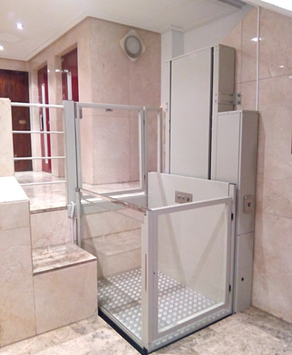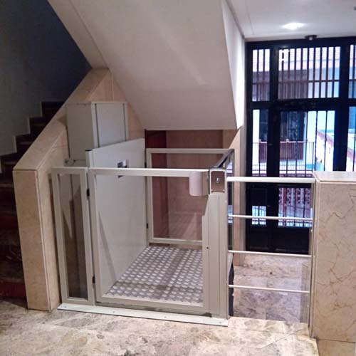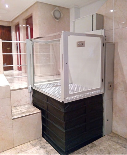 En esta comunidad, gracias a su amplio zaguán hemos montado una plataforma vertical. Es una solución para hacer accesible espacios a diferentes alturas y así poder llegar a la zona del ascensor de una forma libre y con total seguridad. Esta plataforma puede ser utilizada por personas con movilidad reducida, con silla de ruedas y hasta con carrito de bebe.