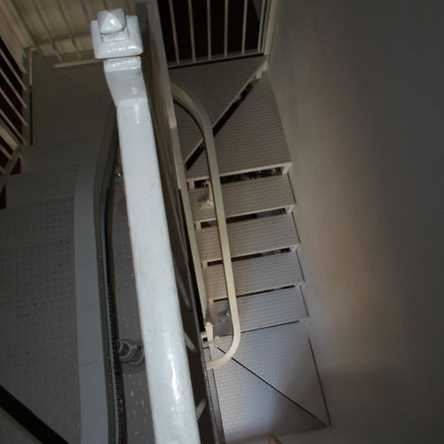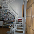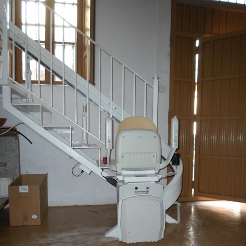 Esta instalación está colocada en un almacén y necesitaban tener acceso a la planta superior, por eso le hemos instalado una silla salvaescaleras Acorn curve. Este tipo de silla se adapta tanto a las escaleras de obra como las metálicas y afronta giros y cambios de pendiente.