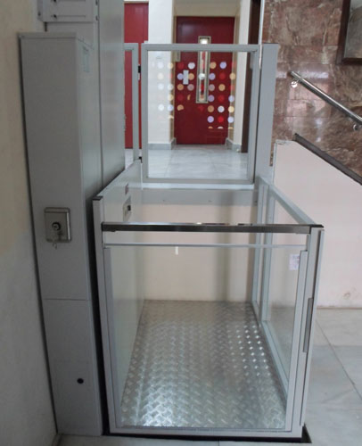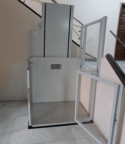 Plataforma vertical Izaro montada en el interior de un edificio de vecinos en Paiporta un municipio que pertenece a la comarca de la Huerta Sur (Valencia).