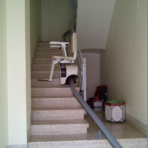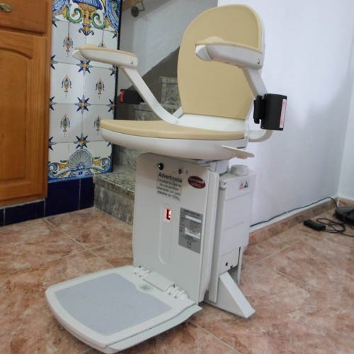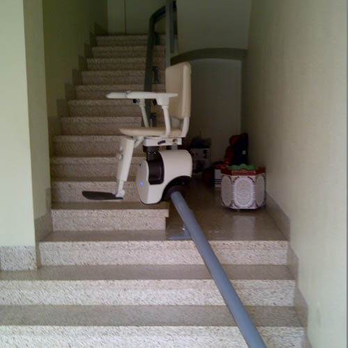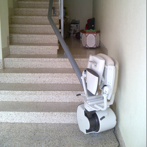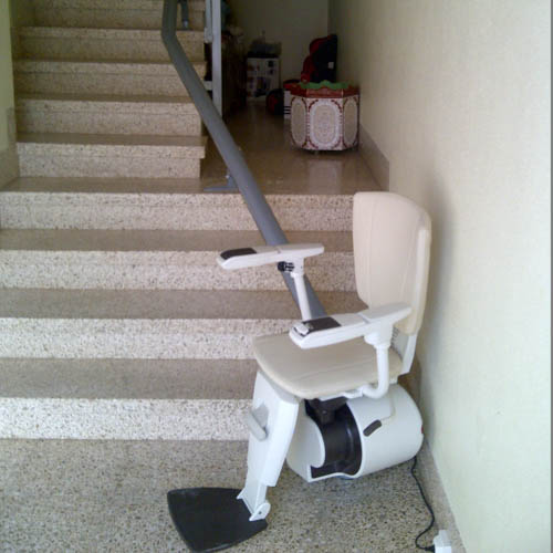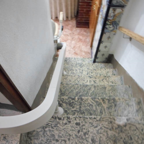 Silla salvaescaleras Curve instalada en una vivienda particular de Palma de Gandía. En este caso nos encontramos con una escalera que se estrecha mucho al inicio debido a un pilar. Gracias al poco espacio requerido para la instalación de la silla Curve ha sido posible dar acceso a su propietario a su dormitorio.