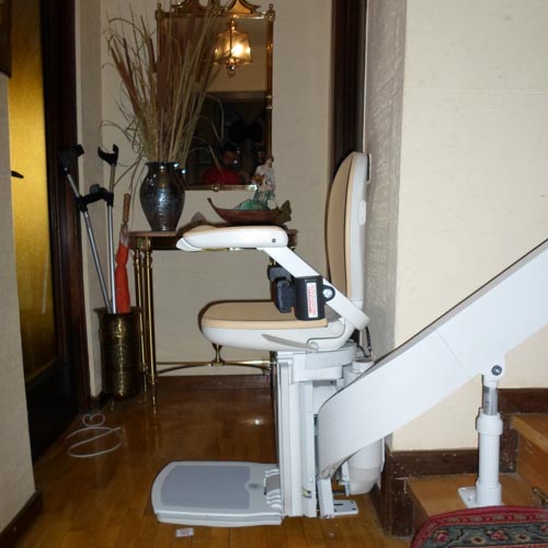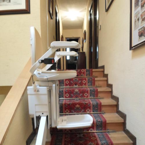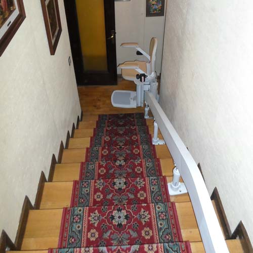 Este tipo de silla no requiere obras ni cambios estructurales, se puede colocar en todo tipo de suelos, anclado directamente a los peldaños. En este caso se ha instalado en un suelo de madera en el lado izquierdo de la escalera.